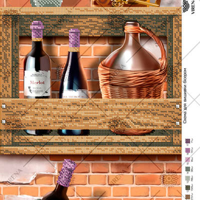 Схема для вышивки бисером Панно "Винная полка" Virena. Рисунок и схема нанесены на габардин. Это качественная ткань, проклеенная флизелином. Срезы ткани обмётаны и не осыпаются. Рисунок водостойкий, чёткий и насыщенный, нанесен на ткань при помощи качественной печати. Схема разработана для вышивания чешским бисером размером 10. Для удобства рукодельницы на шаблоне указаны рекомендуемые цвета бисера (номера не указаны). Это дает возможность самостоятельно подбирать тот вид бисера, который больше нравится. Так же указано необходимое количество бисера каждого цвета в штуках. Бисер в комплект не входит. Можно отдельно заказать комплектацию схемы бисером в нашем магазине. Для этого в процессе оформления заказа в поле "комментарий" нужно написать: "подбор бисера под схему". Так же схему можно укомплектовать бисерными нитками и иглами. Собранный комплект может стать замечательным подарком рукодельнице. Зашивка полотна частичная, вышиваются отдельные фрагменты сюжета. Вышивается винная полка. Бутылки с вином, полный бокал, открытка, цветок в горшке. Кирпичная стена не вышивается. Эта картина украсит гостиную или столовую.